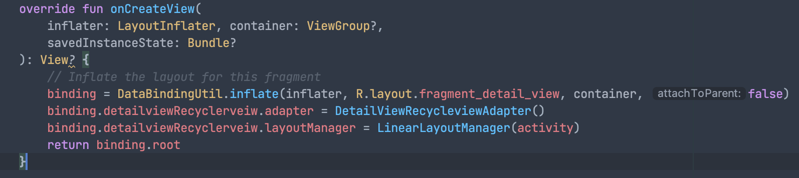 - binding 설정과 onCreateView에 연동시켜준다.