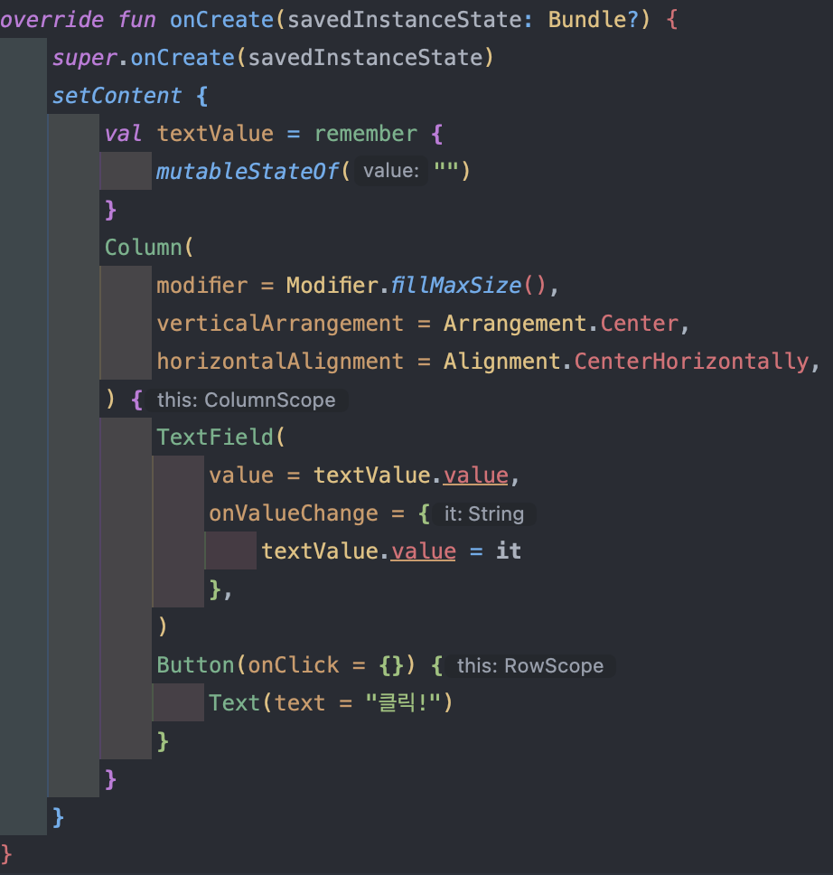 * 여기서 textValue = remember { mutableStateOf("") } 쪽을 구조분해를 사용해 볼 예정이다.