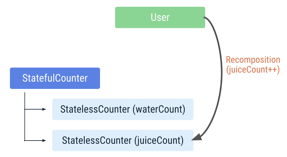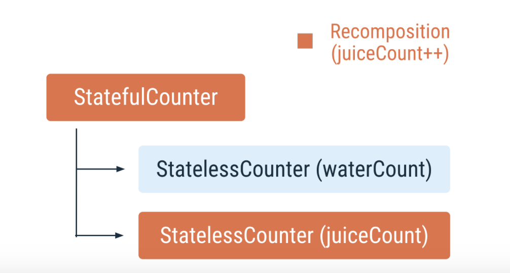 * juiceCount가 수정되면 StatefulCounter가 재구성된다. 리컴포지션 중에 Compose는 juiceCount를 읽는 함수를 식별하고 이러한 함수의 리컴포지션만 트리거한다.